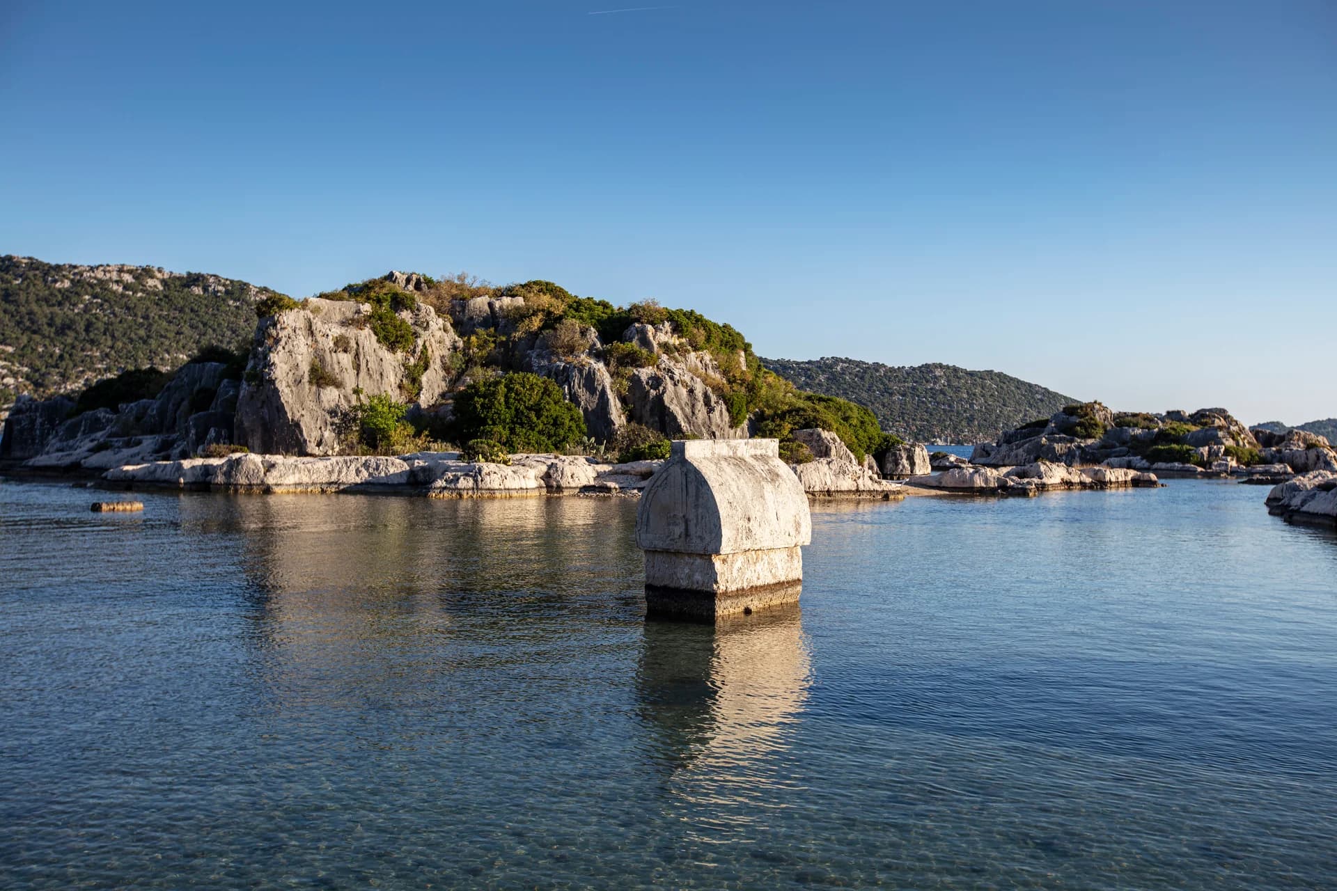 Kekova Adası kıyısında batık antik kent üzerinde yavaş geçiş. Berrak suda antik kalıntıları görme.